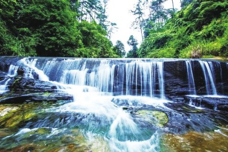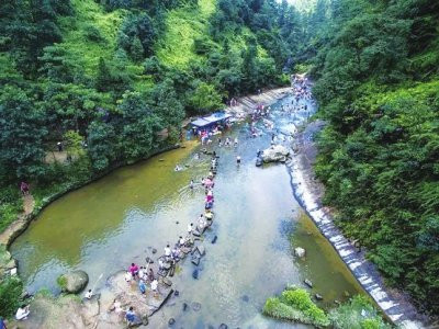 石板河的魅力,在于石与水的和谐共生。整块岩石构成的河床,宽达300米,坡度平缓,常年平均水深仅40到50厘米,安全宜人,是天然的戏水胜地。河水源自穹窿深处,纯净无污染,加上98%的森林覆盖率形成的小气候,夏季气温比周边低4℃~6℃,成为川南罕见的避暑天堂。