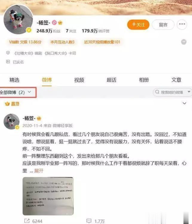 三十多万粉丝的号,干干净净跟新注册的一样,连条转发都没剩,再翻她的微博更有意思,总共就留着一条2020年的动态,还设了半年可见。