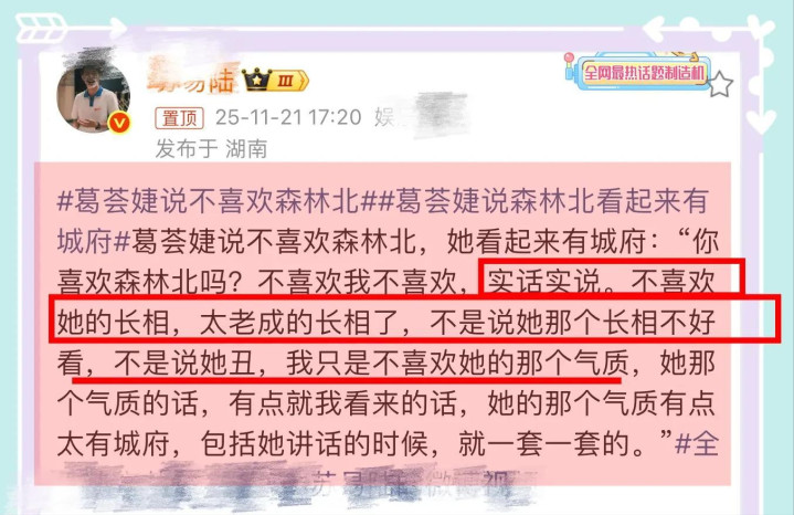 而对于汪峰的现任女友森林北,葛荟婕则丝毫没有给汪峰一丝颜面,直接在直播间坦言,不喜欢森林北,觉得这个人一直是端着的,心机很深。