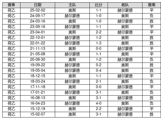 奥斯 VS 赫尔蒙德两队近10年的交战次数为20场,奥斯7胜8平5负,赢球概率为35.0%,平局概率为40.0%,输球概率为25.0%。