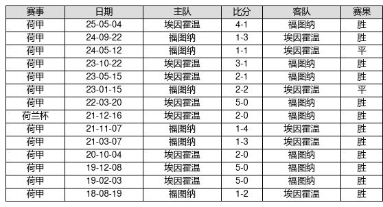 埃因霍温 VS 福图纳两队近10年的交战次数为14场,埃因霍温12胜2平0负,赢球概率为85.7%,平局概率为14.3%,输球概率为0.0%。