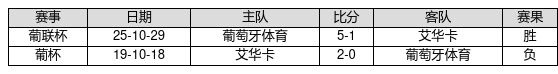 葡萄牙体育 VS 艾华卡两队近10年的交战次数为2场,葡萄牙体育1胜0平1负,赢球概率为50.0%,平局概率为0.0%,输球概率为50.0%。