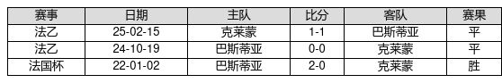 巴斯蒂亚 VS 克莱蒙两队近10年的交战次数为3场,巴斯蒂亚1胜2平0负,赢球概率为33.3%,平局概率为66.7%,输球概率为0.0%。