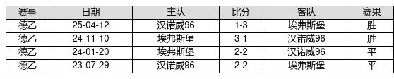 埃弗斯堡 VS 汉诺威96两队近10年的交战次数为4场,埃弗斯堡2胜2平0负,赢球概率为50.0%,平局概率为50.0%,输球概率为0.0%。