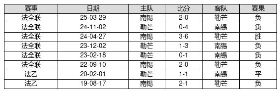勒芒 VS 南锡两队近10年的交战次数为8场,勒芒1胜1平6负,赢球概率为12.5%,平局概率为12.5%,输球概率为75.0%。